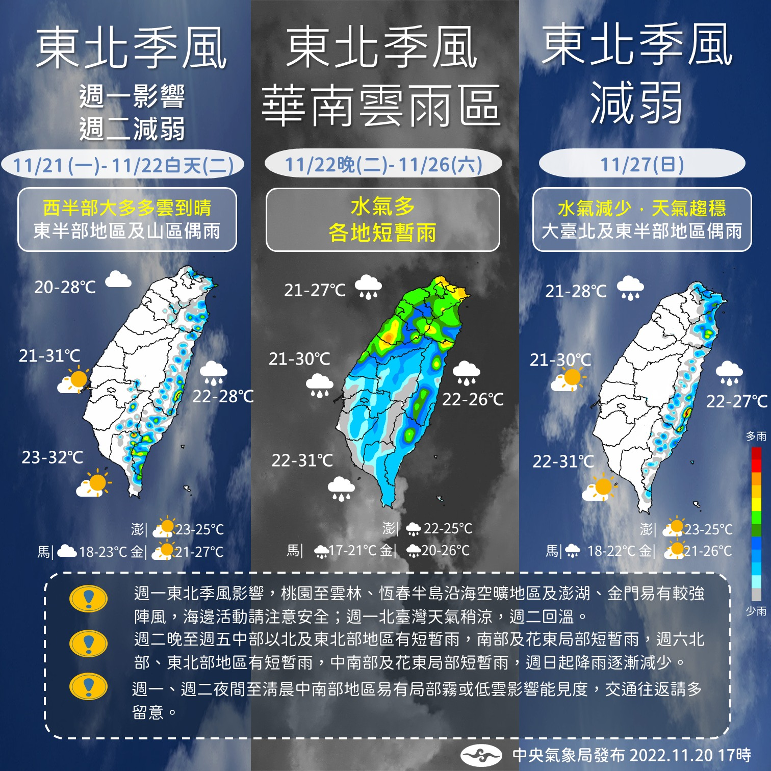 暫別連日的暖陽,今日起鋒面通過適逢東北季風增強,華南雲雨區逐漸東移中,中部以北、東半部降雨明顯,降溫有感,北台灣高溫平均溫度約24度、中部27度,預計本周六雨勢才會逐漸減少。